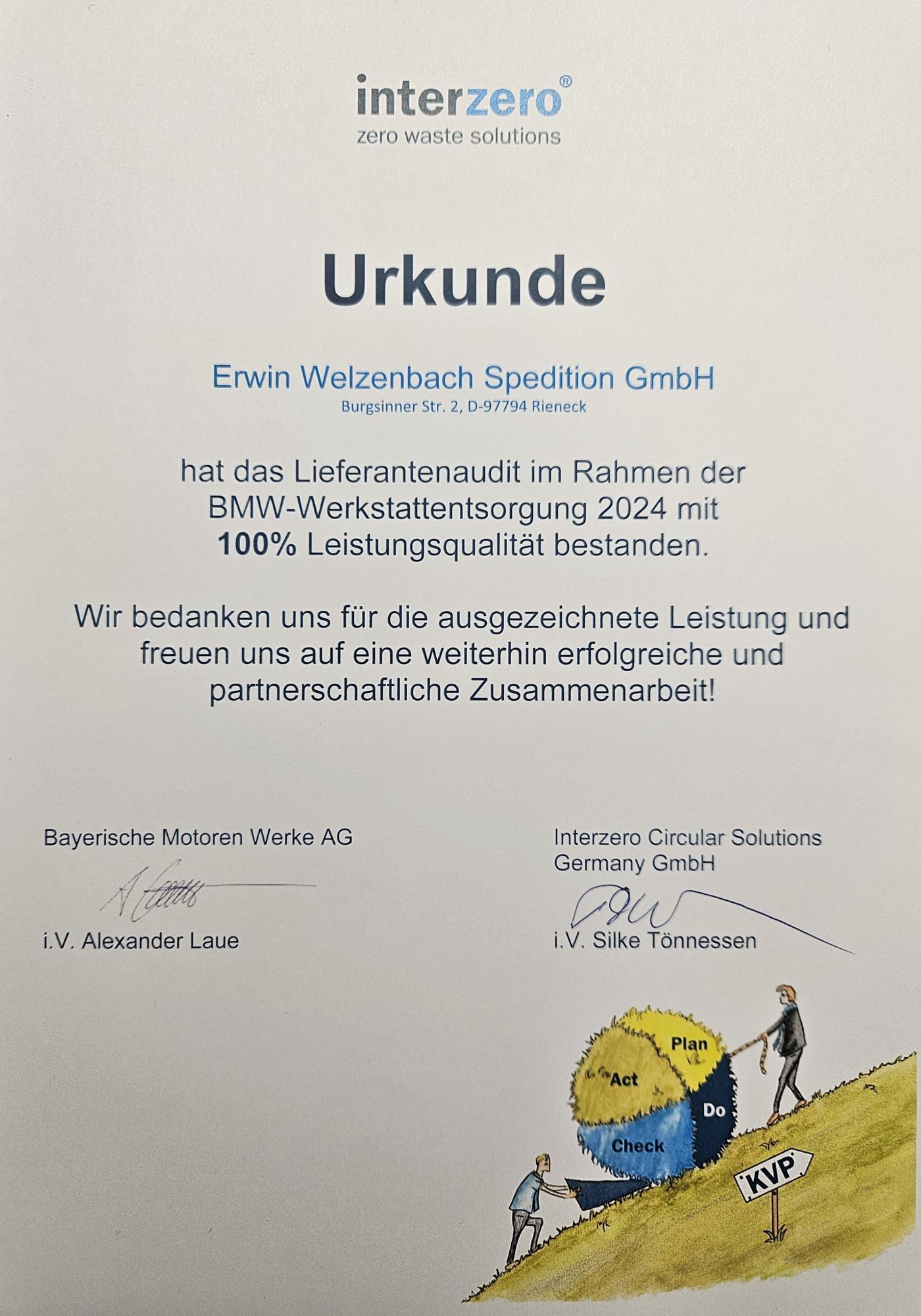 Mit großer Freude dürfen wir verkünden: Die Erwin Welzenbach Spedition GmbH hat das Lieferantenaudit von interzero im Rahmen der BMW Werkstattentsorgung 2024 mit 100% Leistungsqualität bestanden.